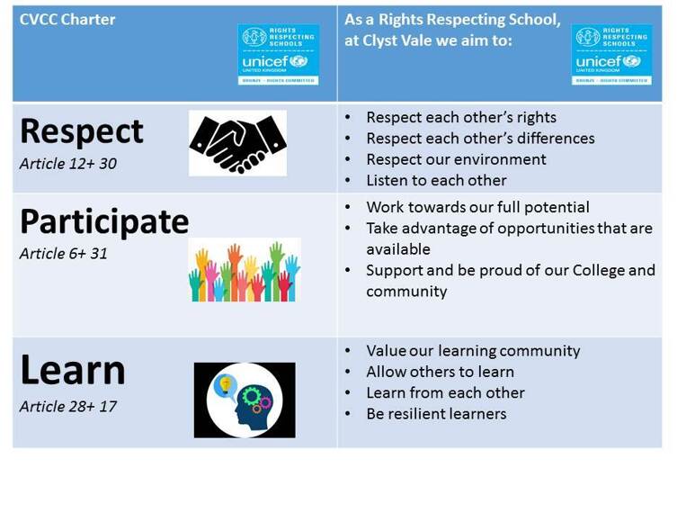 A Rights Respecting School puts the United Nations Convention on the Rights of the Child (https://www.unicef.org.uk/what-we-do/un-convention-child-rights/) at the heart of everything we do. This means that we ensure that pupils at Clyst Vale know their rights and as adults, we make decisions with the best interests of the child in the forefront of our minds. We teach students about the importance of becoming Global Citizens and ensure that they learn about world events. Moreover, we take time to teach students about developing their full potential and ensure that they learn about people who don’t have access to their rights. We have always been an inclusive and caring school but this award has helped to frame a lot of the great work that already goes on at Clyst Vale.